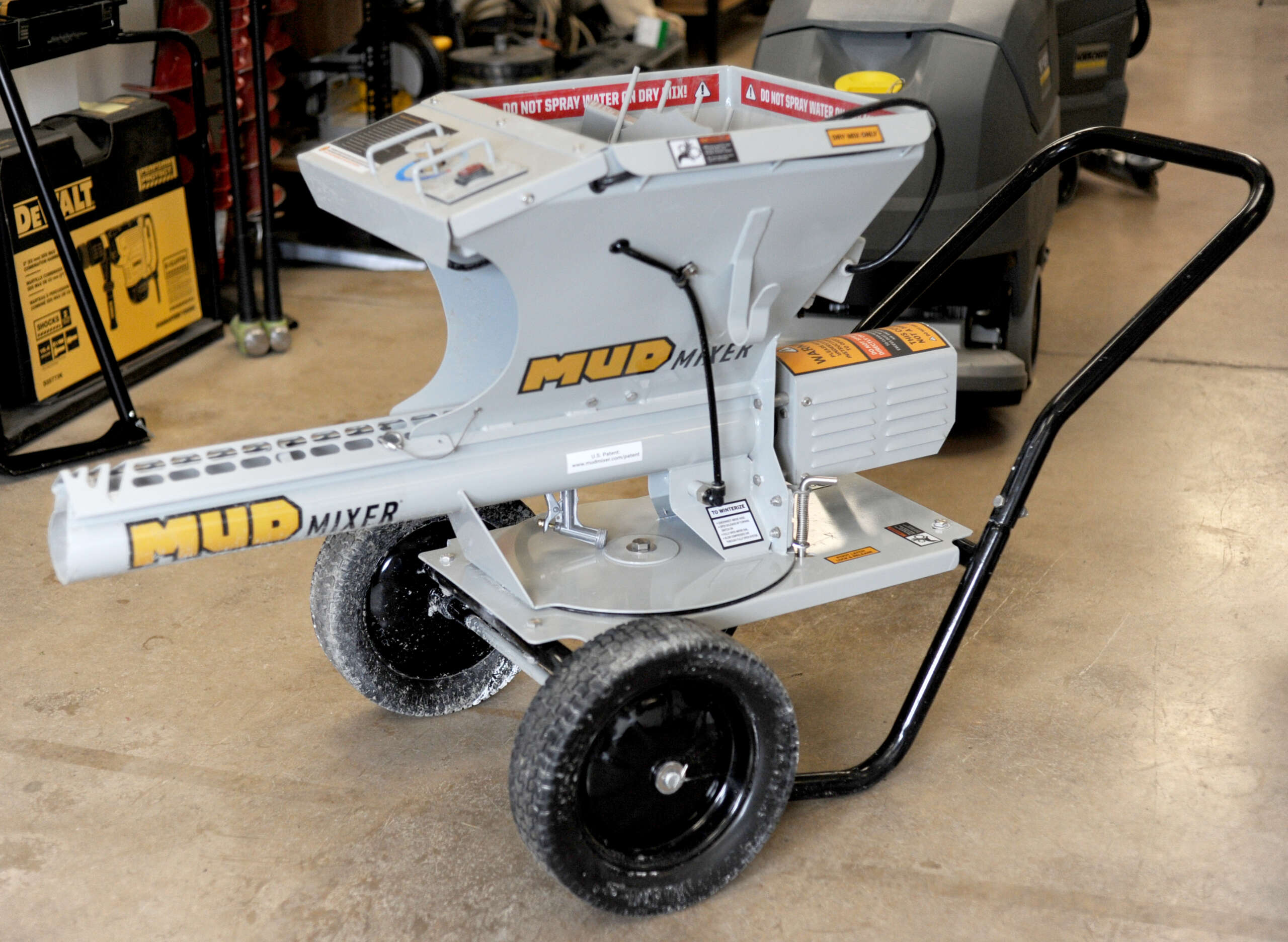 The Mud Mixer rental features a fully adjustable water input, allowing it to be used with concrete, mortar, stucco mix, poolkrete, and others. It can mix 45 eighty-pound bags an hour.