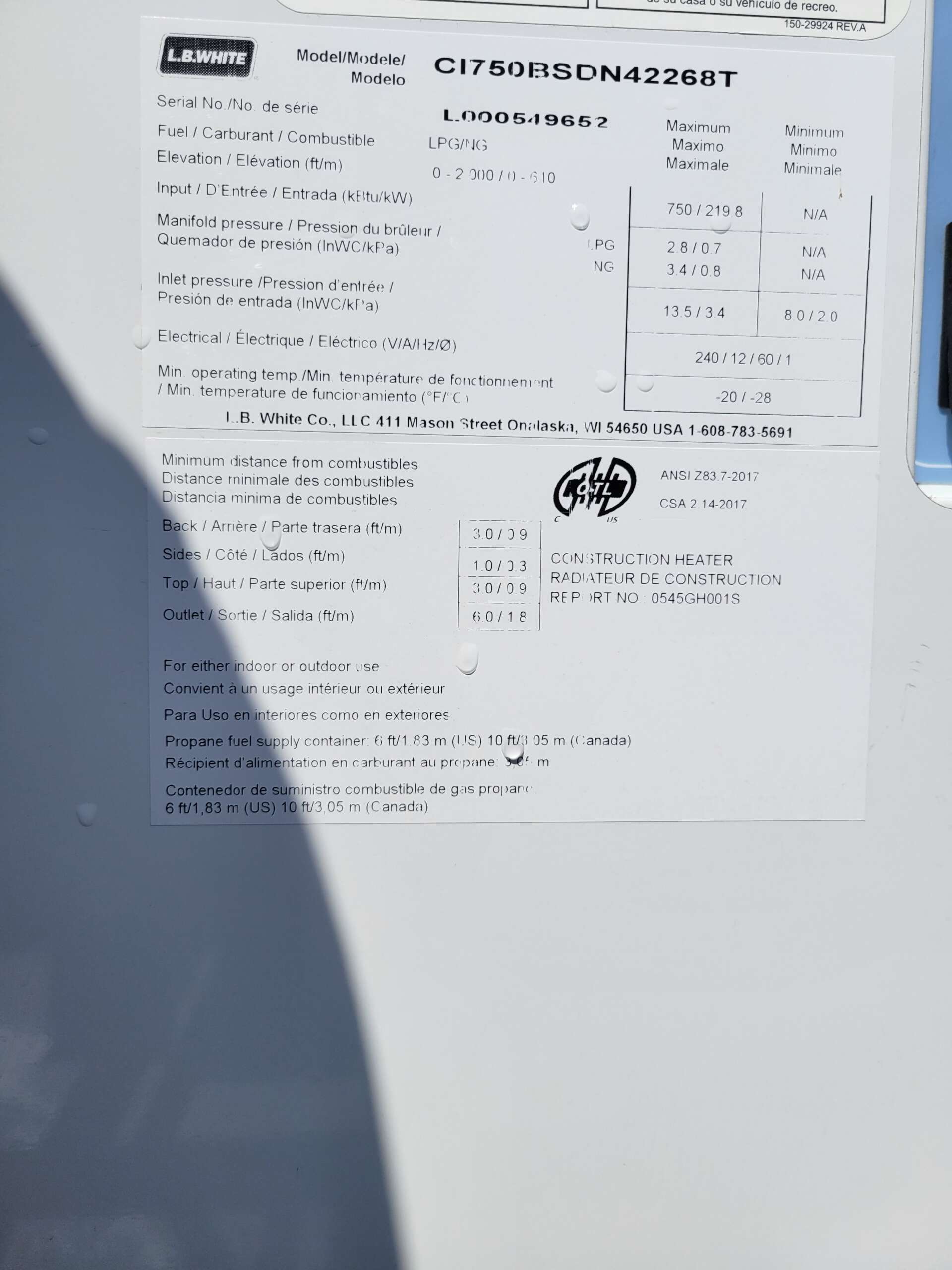 2021 LB White Foreman 750DF, 750,000 BTU NG/LP heaters used for one job can now be yours to make your jobsite nice and toasty for the winter and many more to come. Call our Rental Equipment Specialist to find out more information. Asking $10,300.00 for each unit with 3 of them available.